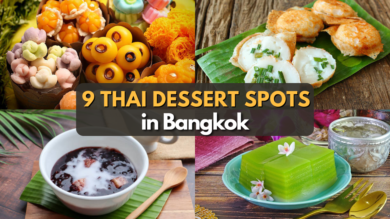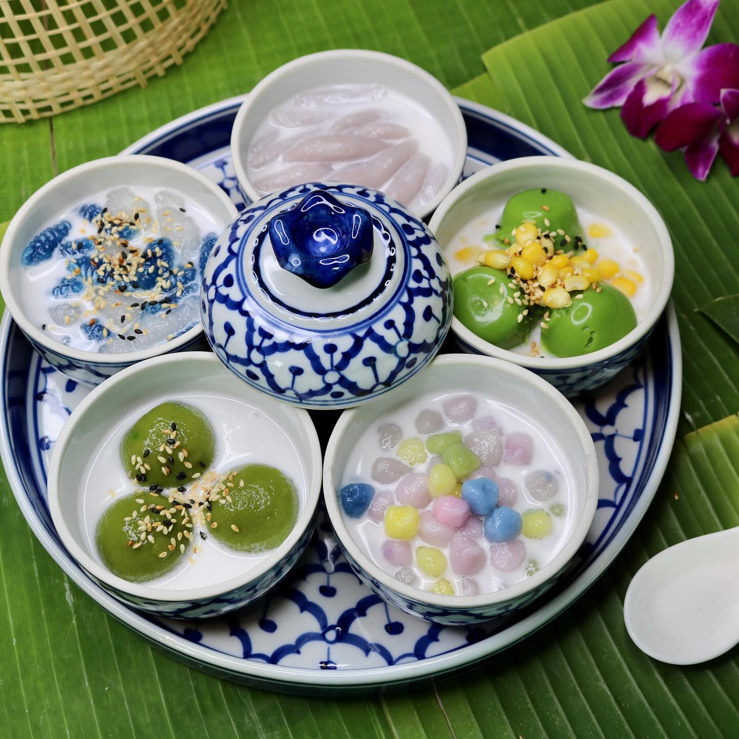 Must-Eat: Khanom Chan (steamed pandan layer cake), Bua Loy (glutinous rice balls in coconut milk), Piak Poon (charcoal pudding).